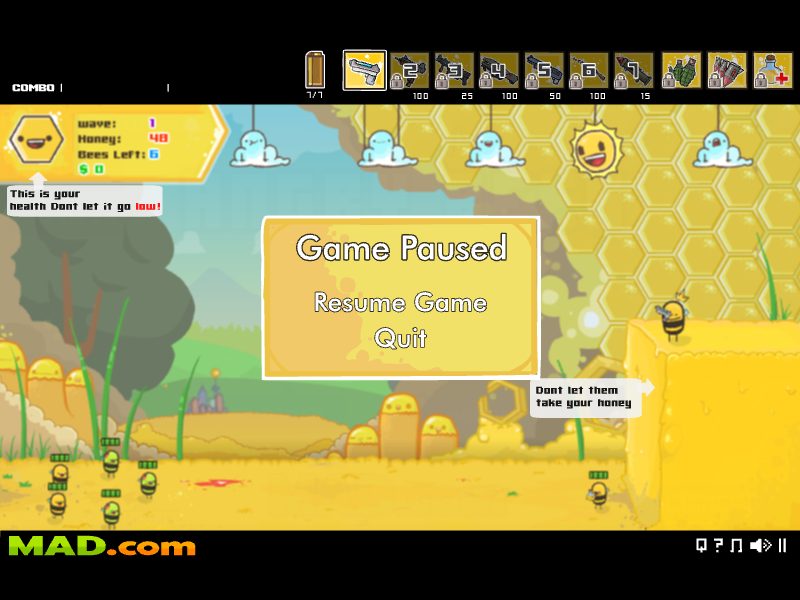 Your the king of bees and your hive is under attack by evil bees! Kill them all! Angry Bees is a survival shooter where you must kill everything that tries to steal your honey! The controls are simple: aim and shoot with the mouse! Also make sure you upgrade your guns so that they are more efficient on the battlefield! Good luck, and BEE careful!