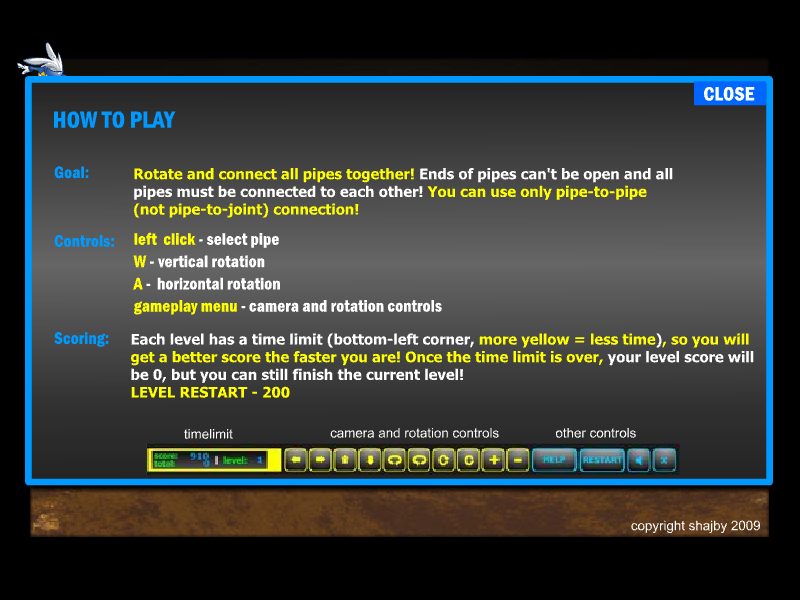 Your objective is to connect the pipes in each level; to do this click on the one you want to rotate and turn it until you place it correctly.