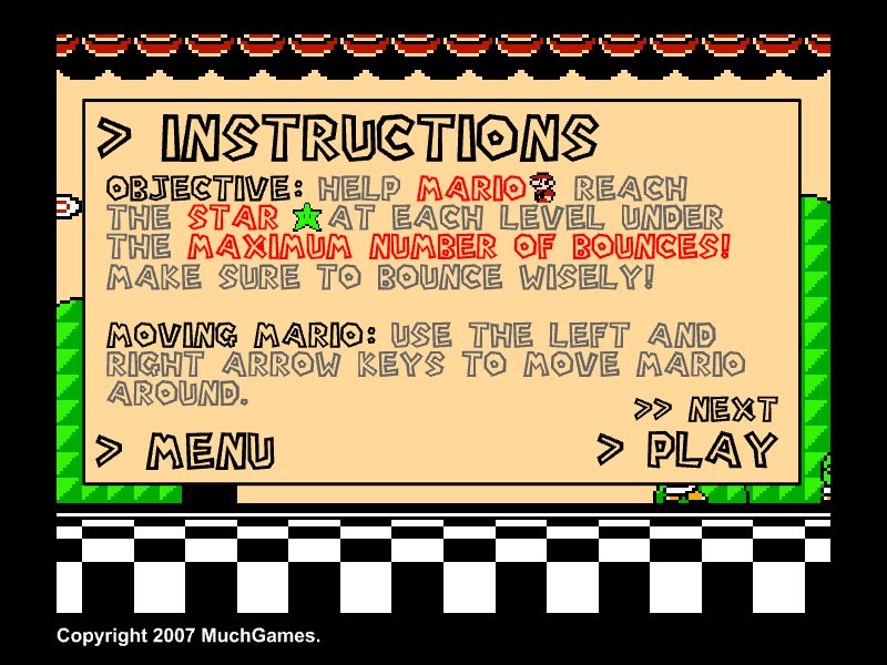 Mario is in a bouncy mood, guide him towards the exit without getting him into too much trouble. There's a maximum number of bounces you can make, so bounce wisely!